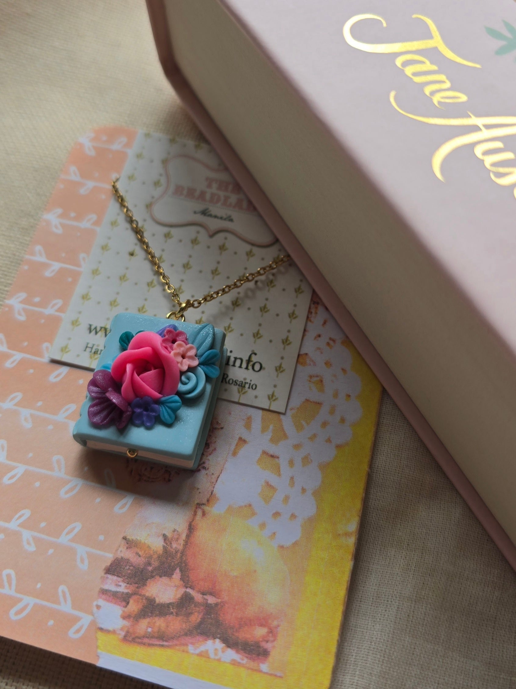 Precious little book pendant adorned with a spray of flowers. Comes with an 18-inch link chain.