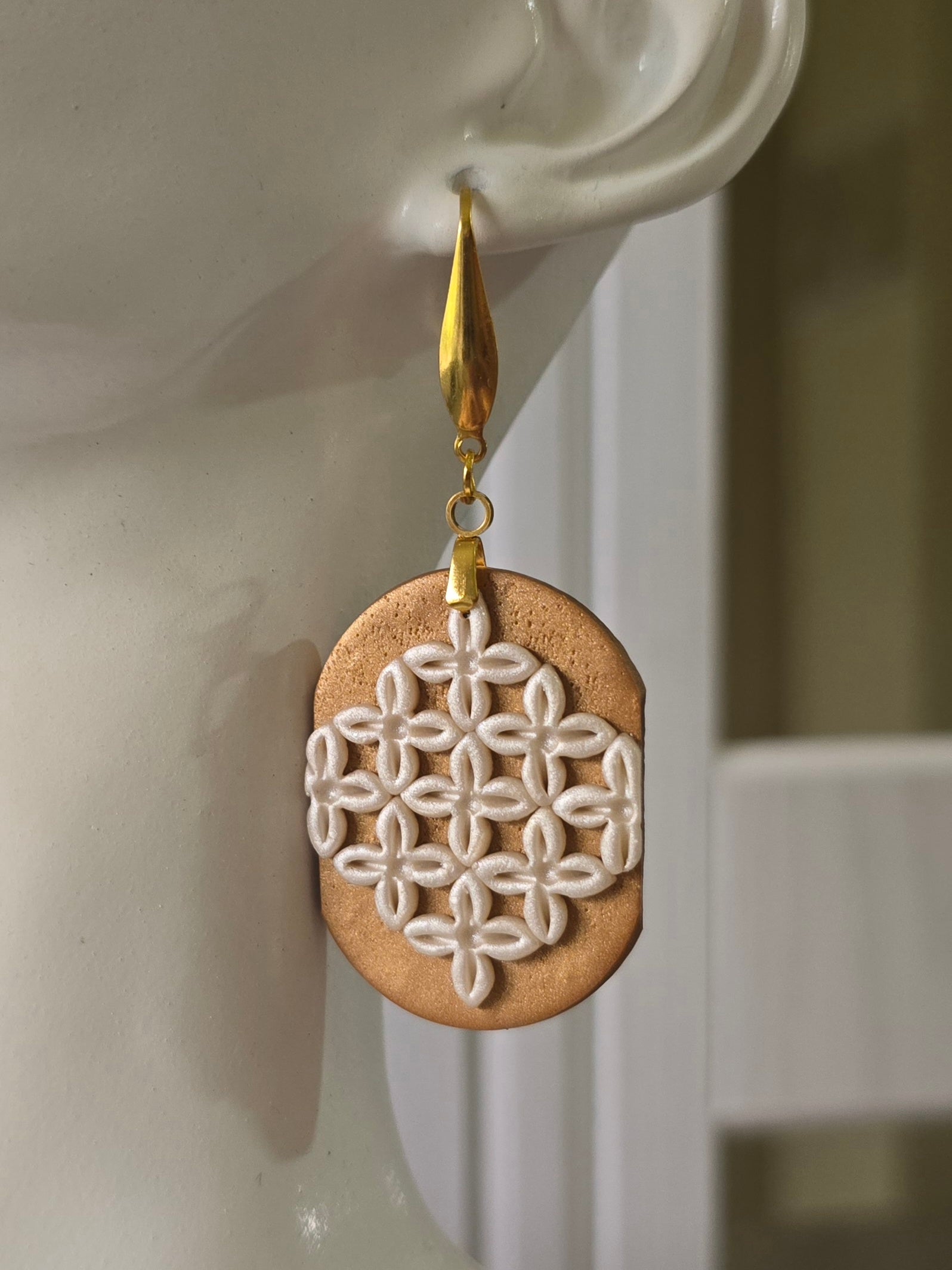 A tribute to the sunlit windows of old Filipino homes, these earrings feature pearl lattice details on a warm arcose sandstone base. Handcrafted from polymer clay, they capture the quiet grace of heritage, and the soft glow of home.