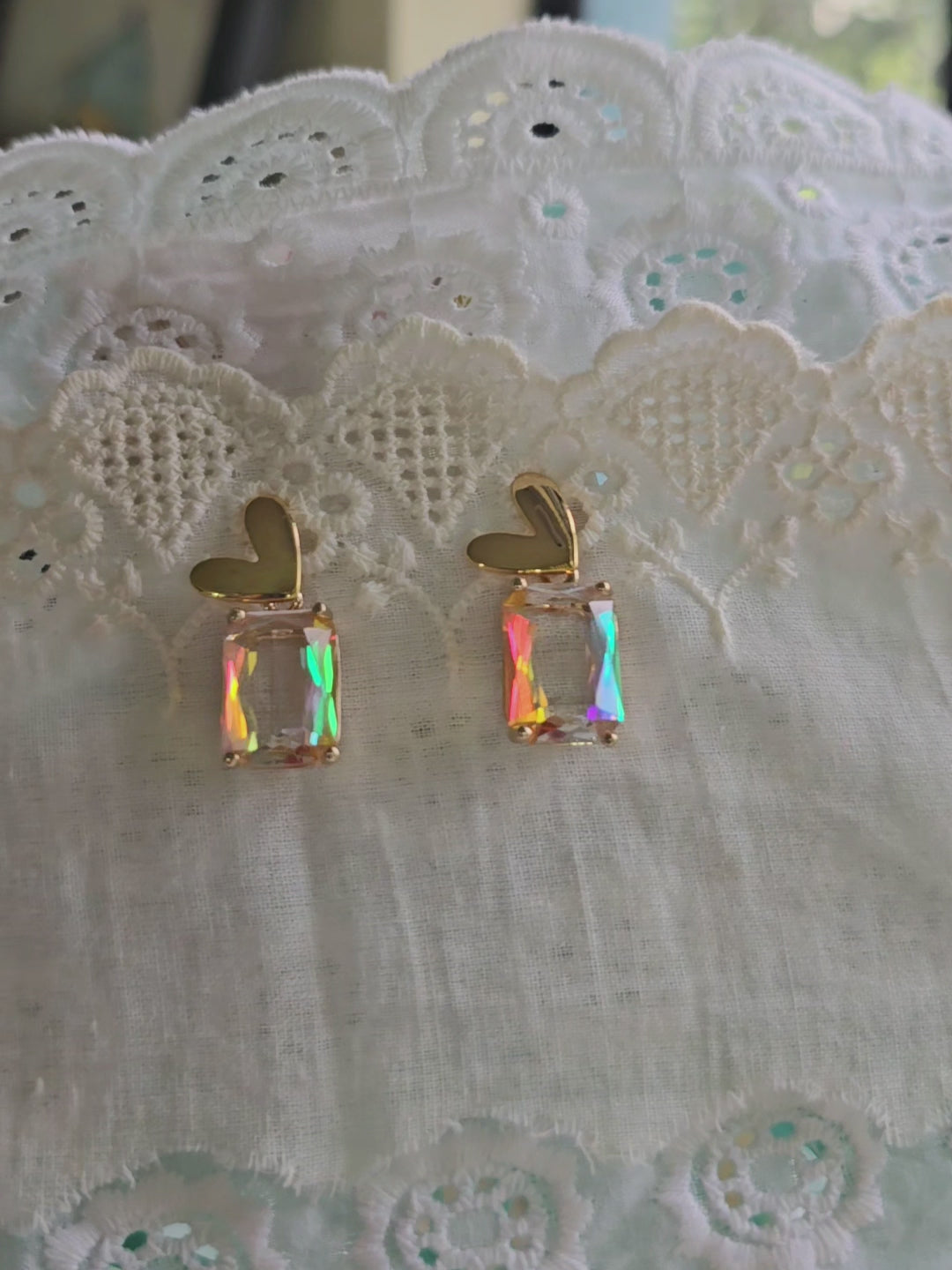 Clear faceted glass with prismatic rainbow shimmer, set in gold-tone bezels.